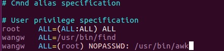wangw all=(root)nopasswd:/usr/bin/awk //wangw用户可在任何终端运行,以root身份执行awk命令且不需要密码