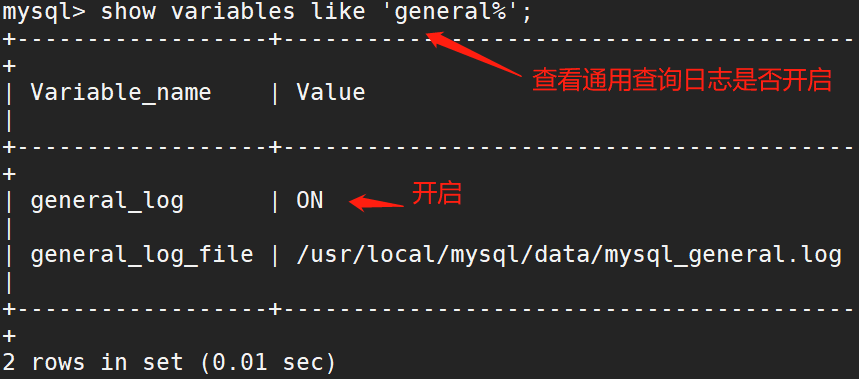 show variables like 'general%'; #variables 表示变量 like表示模糊查询