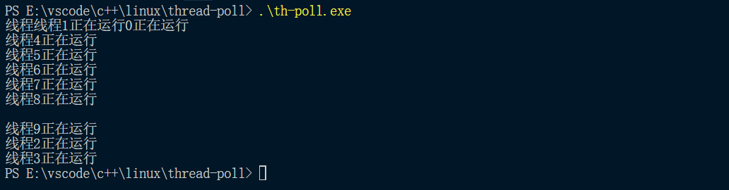 int main(int argc,char** argv) { ThreadPoll poll(4); std::mutex cout_mutex; for (int i = 0;i < 10;i++) poll.enqueue([i,&cout_mutex](){ std::unique_lock<std::mutex> lock(cout_mutex); std::cout << "线程" << i << "正在运行" << std::endl; }); return 0; }在这段代码中,创建10个任务被放入队列中,被取出读取执行,最多同时4个线程运行,主函数触发return 0后触发析构,等待线程结束后,退出。