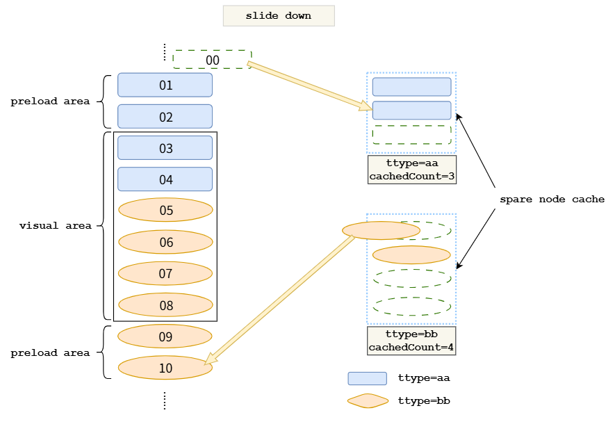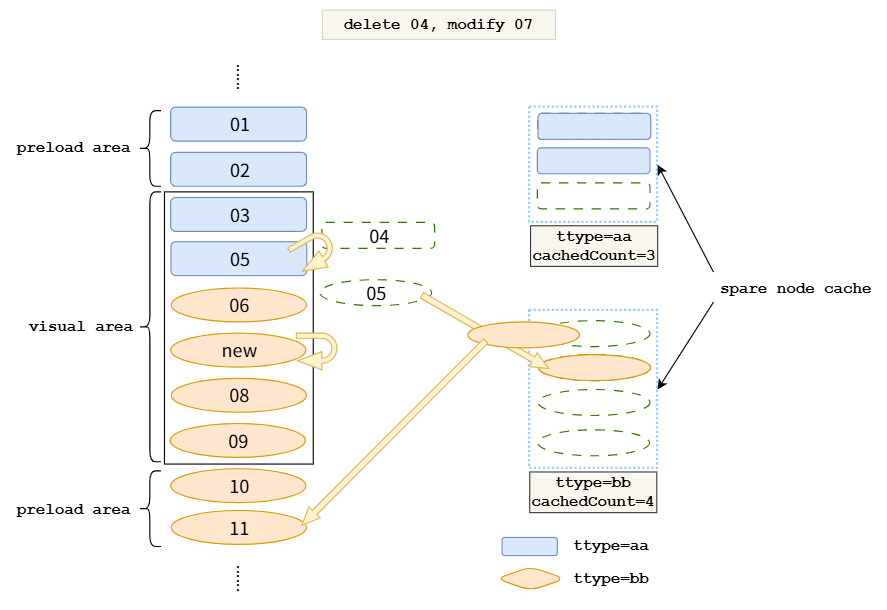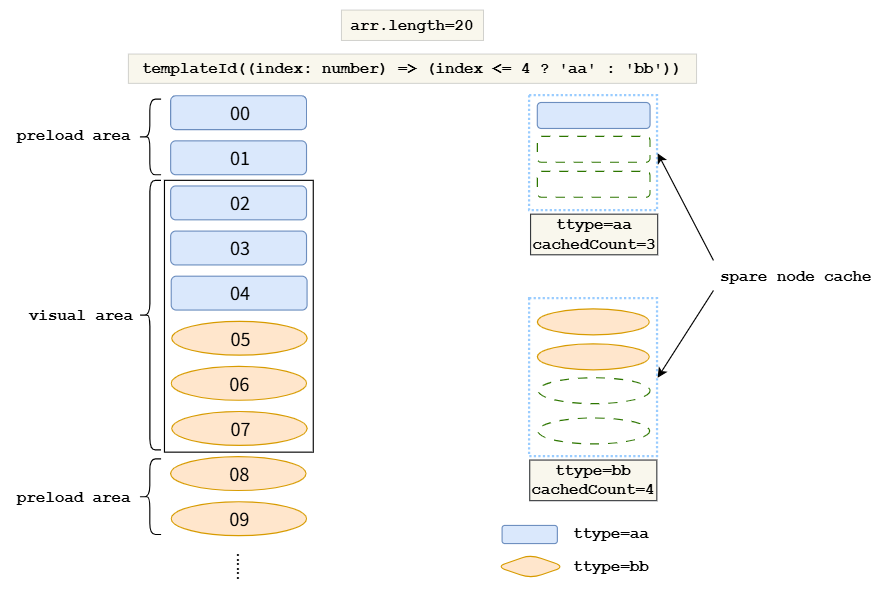 定义长度为20的数组,数组前5项的template type为aa,渲染浅蓝色组件,其余项为bb,渲染橙色组件。aa缓存池容量为3,bb缓存池容量为4。容器组件的预加载区域大小为2。为了便于理解,在aa和bb缓存池中分别加入一个和两个空闲节点。