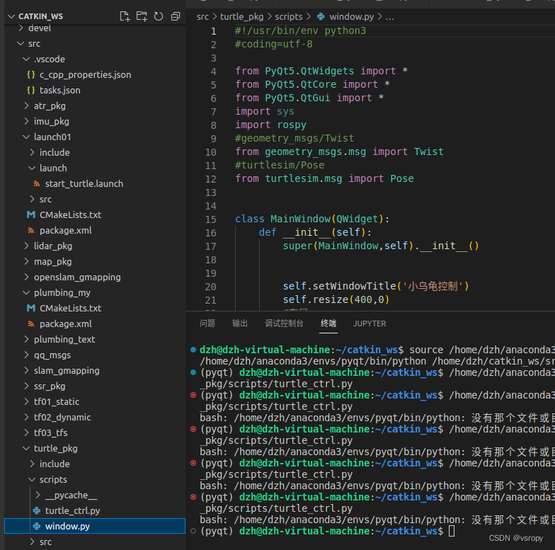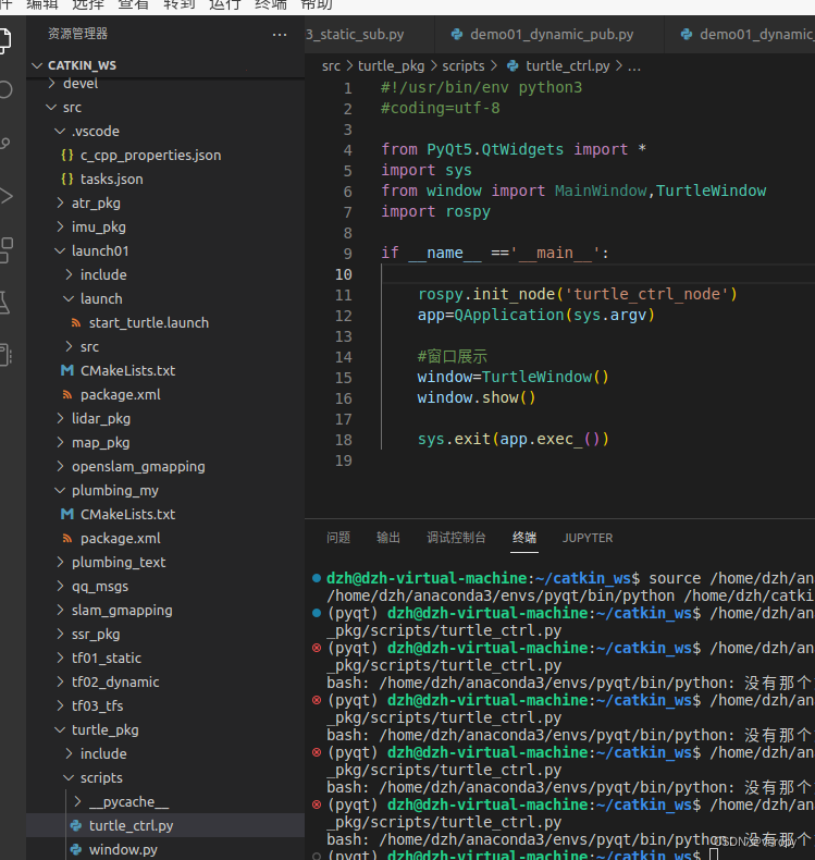 该代码示例展示了如何结合PyQt5创建GUI界面,通过ROS节点控制`turtle1`的速度,并订阅`turtle1/pose`话题以显示乌龟的实时位置信息。用户可以输入线速度和角速度,点击发送按钮来更新小乌龟的运动状态。