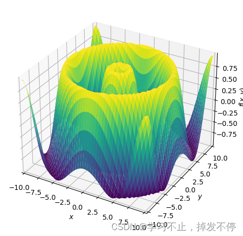 plot3d(sin(sqrt(x**2 + y**2)),(x,-10,10),(y,-10,10),xlabel = '$x$',ylabel = '$y$')