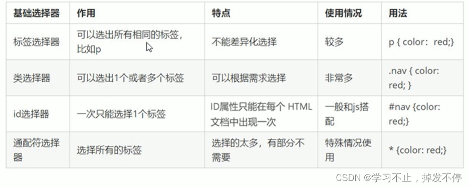 类选择器在修改样式上使用是最多的,id选择器一般用于页面上唯一性的元素,常和JavaScript配合使用。