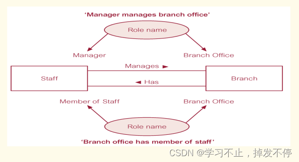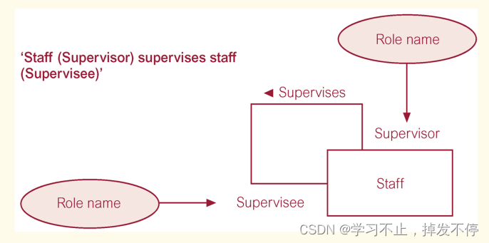A typical business example arises when we have a business rule such as "a staff member supervises other staff members". • The role of one staff member may be supervisor[管理者] whereas the role of another staff member may be supervisee.