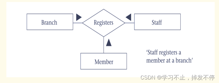 Relationships of degree 2 are called binary relationships; relationships of degree 3 are called ternary relationships[三元关系]. In general, we speak of n-ary relationships where n entities participate in a relationship.