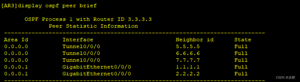[AR7-Tunnel0/0/0]ospf dr-priority 0 //DR、BDR选举优先级改为0,不参与其选举,避免选举混乱
