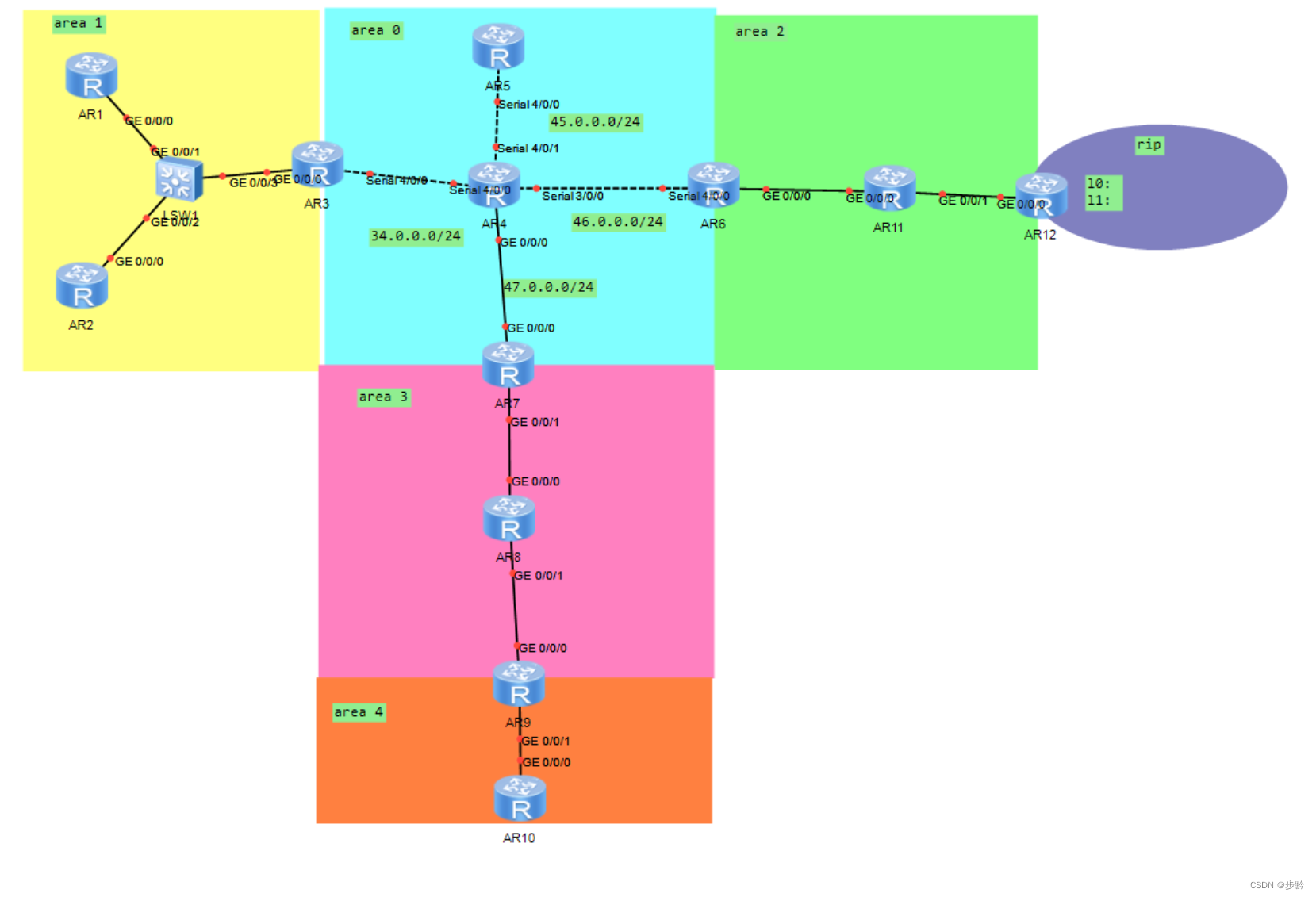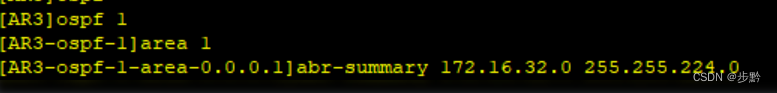 totally stub区域:area1(以AR1为例子,其他属于area 1区域的均相同的配置命令) totally nssa区域:area 2,area 3(以AR11为例子,其他属于area 2,3区域的均相同配置命令)