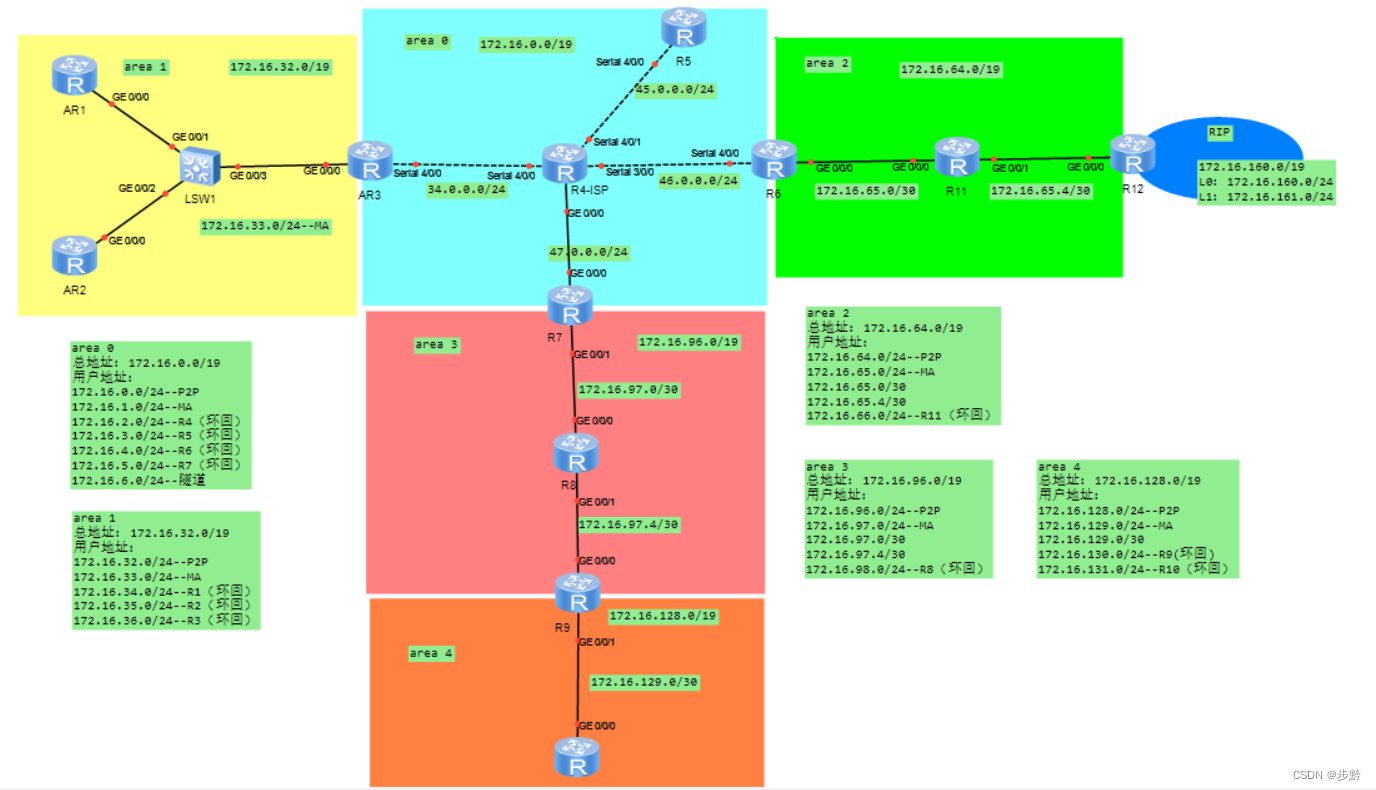 基于ospf区域划分,其中有五个ospf区域,一个rip宣告的两个环回网段(area 0主要是将虚拟隧道含的一些地址划入),所以先划分6个大网段(向后取3位子网掩码,划分8个网段取6个)