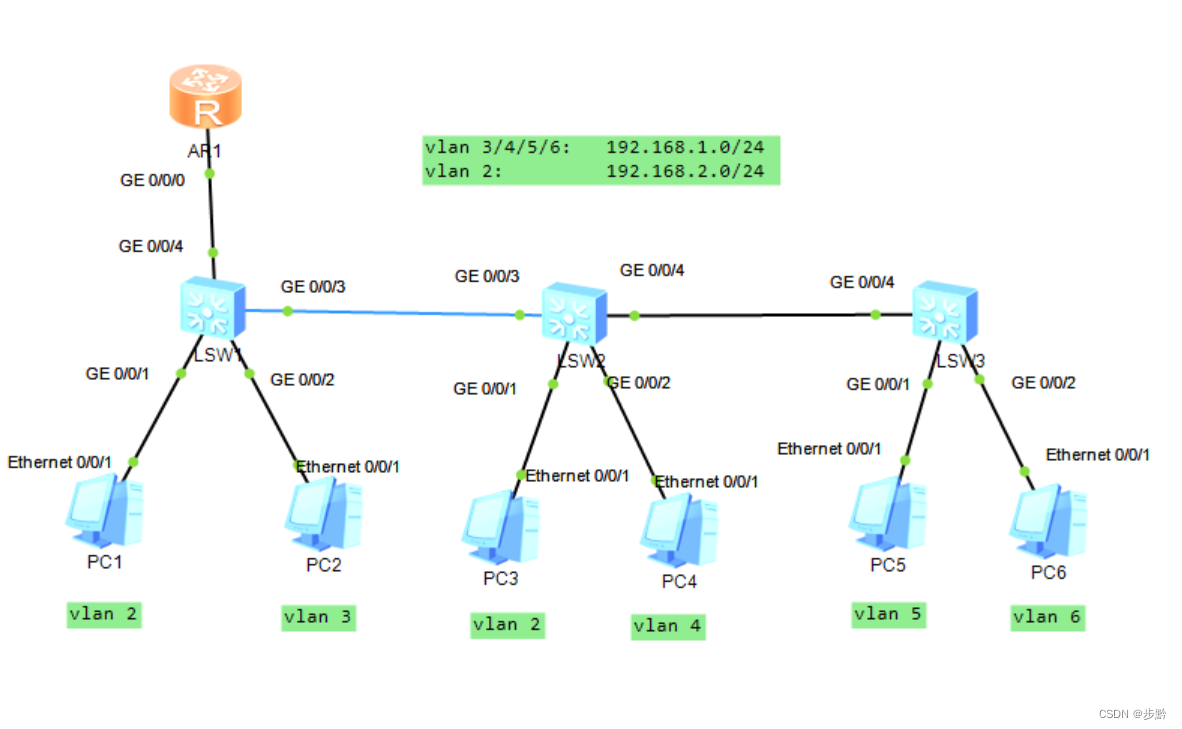 [LSW1-GigabitEthernet0/0/3]port trunk allow-pass vlan 2 to 6 //放通vlan 2 to 6