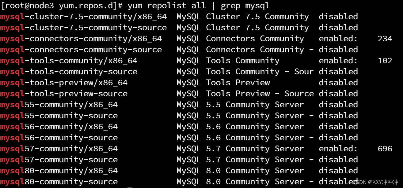 [root@node3 yum.repos.d]# yum repolist enabled | grep "mysql.*-community.*" #开启的安装包