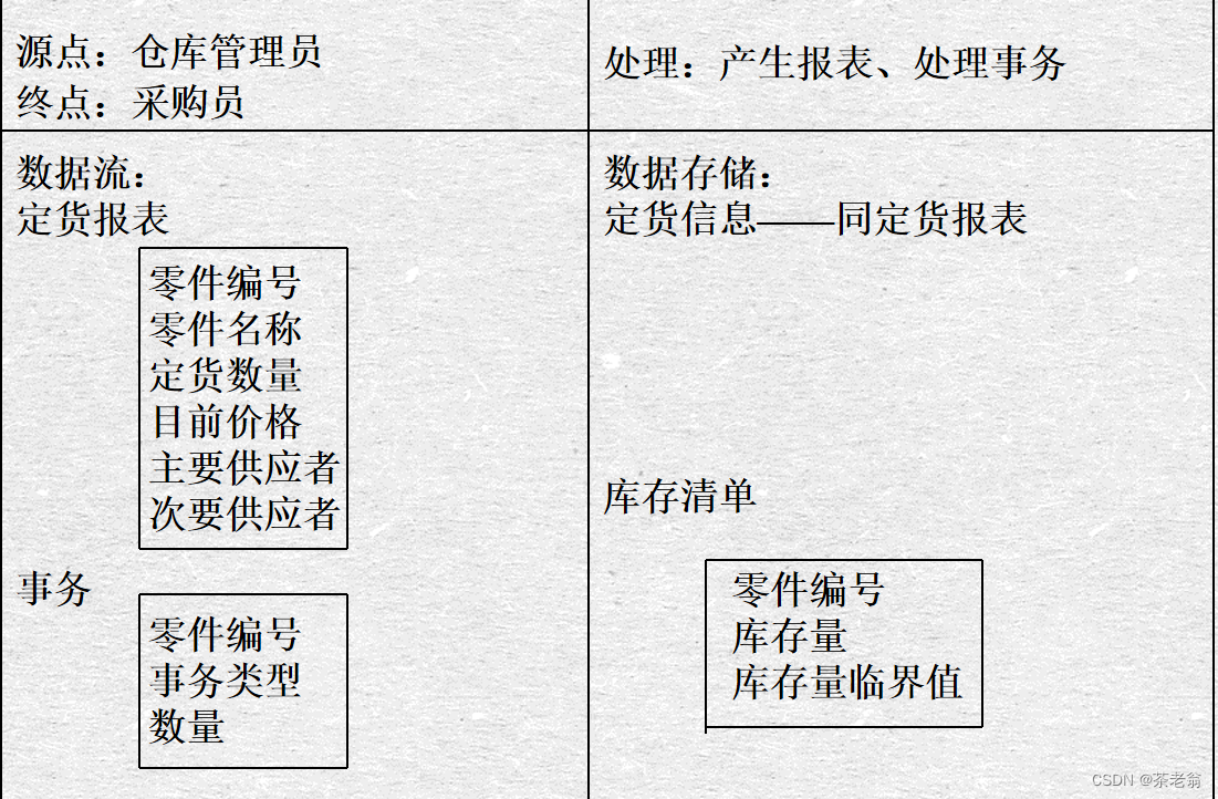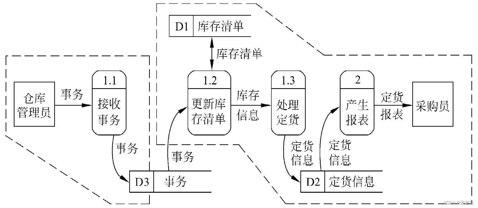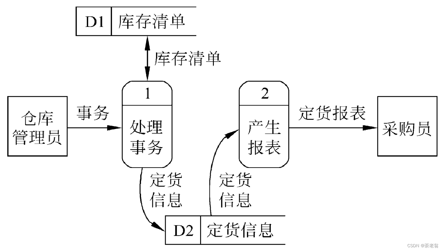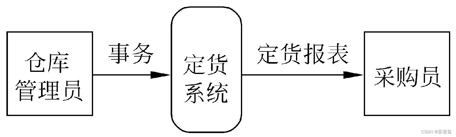 “通过放在仓库中的CRT终端把事务报告给定货系统”——仓库管理员是数据源点 “采购部每天需要一张定货报表”——采购员是数据终点