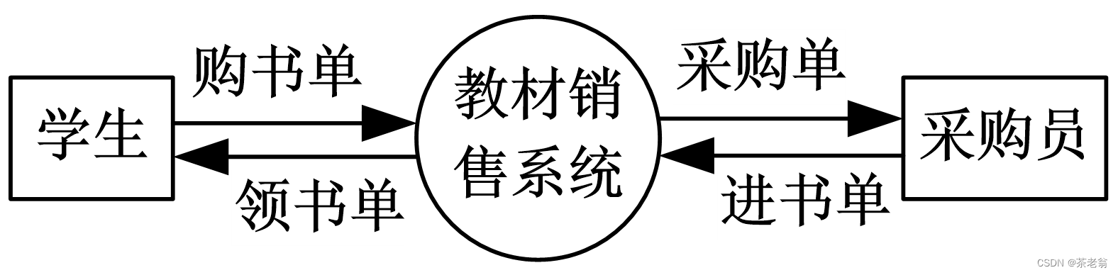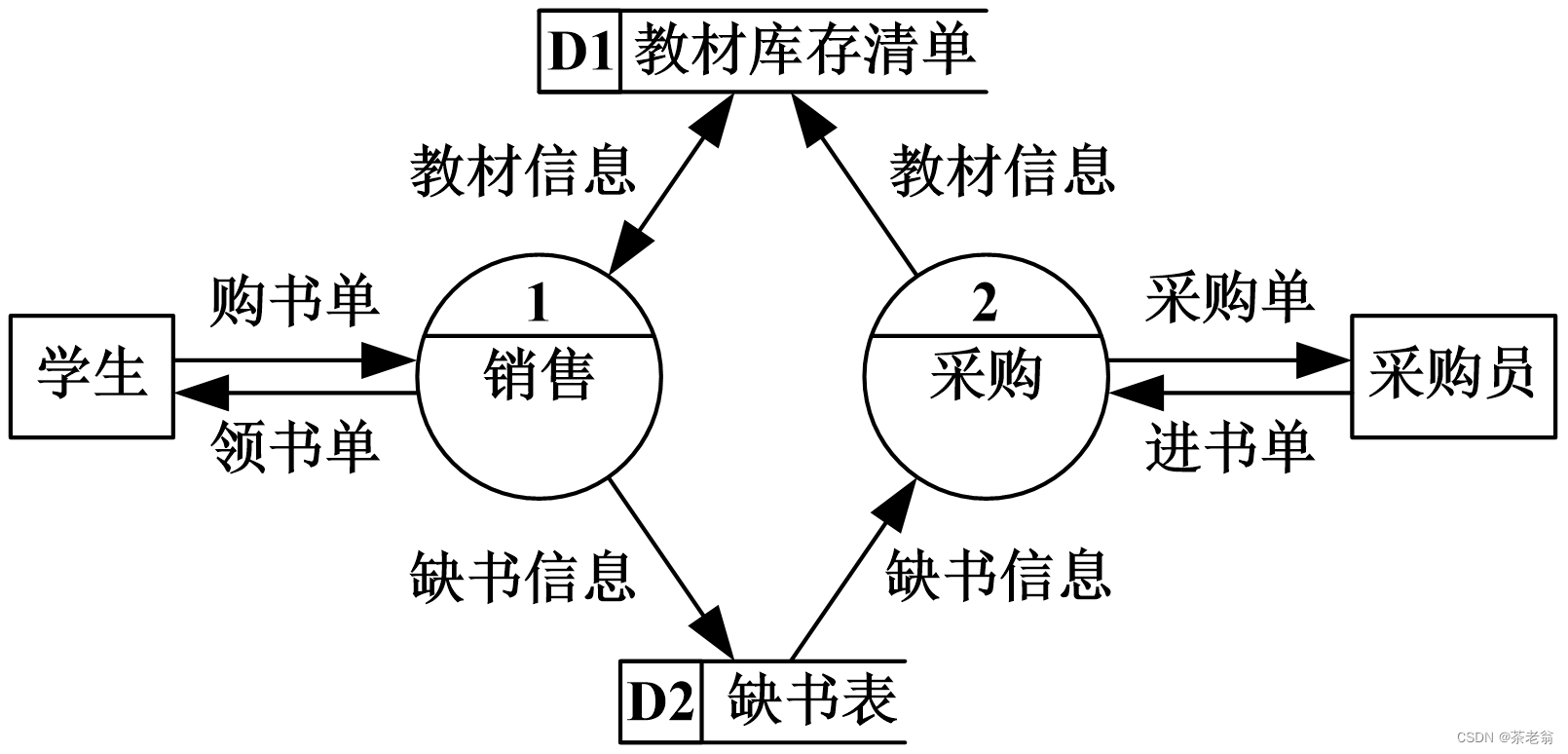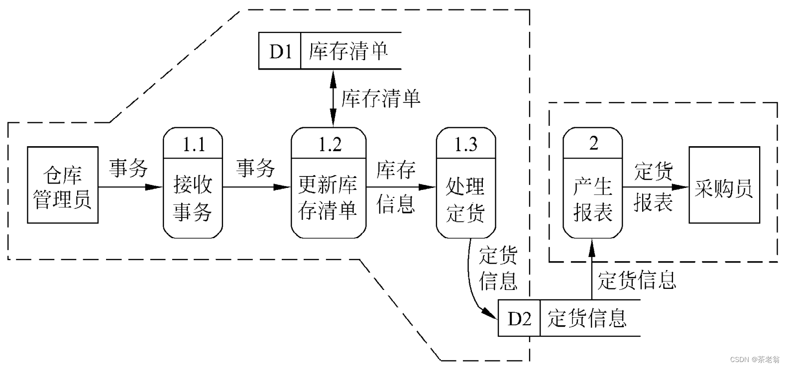 “通过放在仓库中的CRT终端把事务报告给定货系统”——仓库管理员是数据源点 “采购部每天需要一张定货报表”——采购员是数据终点