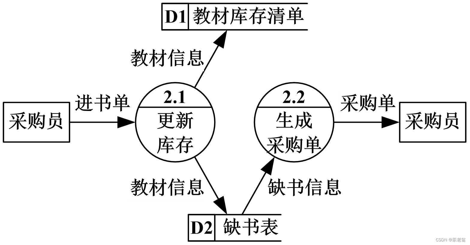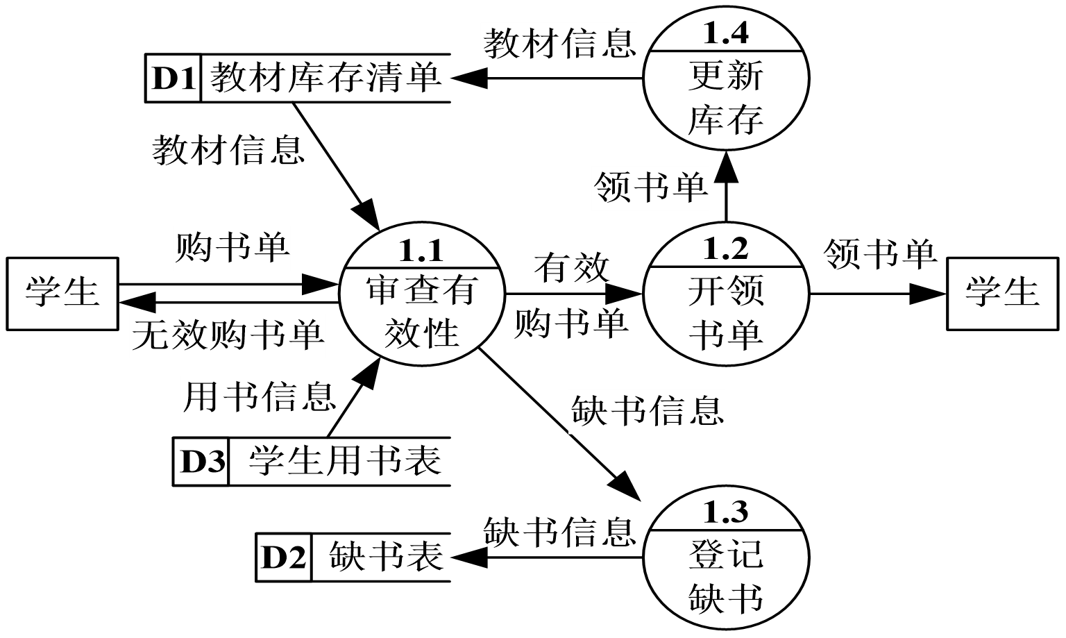 销售时,根据学生用书表和教材库存清单对购书单进行有效性审查,通过审查后得到有效购书单,并将缺书信息写入缺书表。交完款后开领书单,根据领书单更新教材库存清单。 采购时,将缺书表中的信息汇总生成采购单,新书进库时更新教材库存清单。