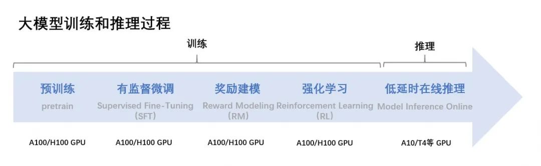 这张图其实比较清晰的把模型训练的过程以及所需要的资源都做了直观的归纳,能够看到模型训练的过程除了前期的预训练,还包括有监督的微调、奖励建模、强化学习,以及这些过程都需要底层硬件GPU来做支持。