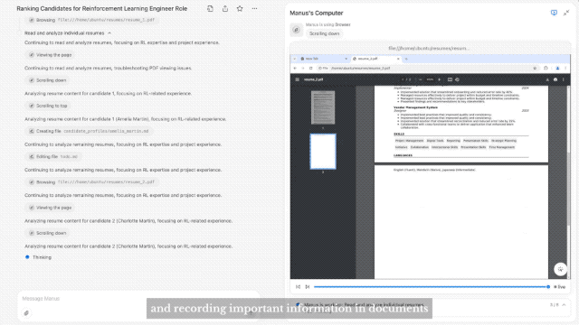 筛选简历:Manus能像专业招聘人员一样工作,从解压文件到逐页浏览每份简历,记录重要信息,并给出排名建议。值得注意的是,Manus还能异步处理文件,这意味着用户可以随时关闭电脑,任务完成后会收到通知。