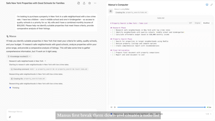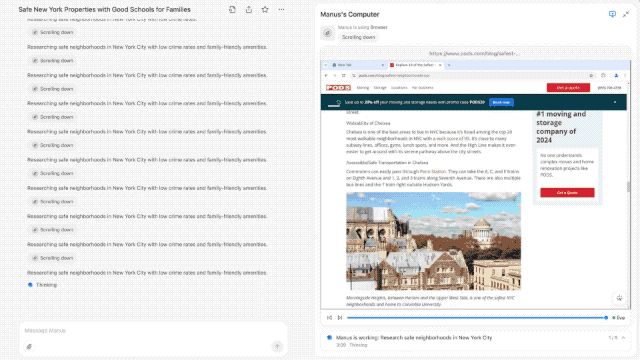 房产筛选:结合家庭收入情况和子女上学要求,Manus能在特定地区筛选安全、犯罪率低的社区,并购买符合标准的房产。面对这类复杂任务,Manus会将其拆解为多个步骤,包括搜索相关文章、研究学校情况、编写Python程序计算预算、筛选房源等。