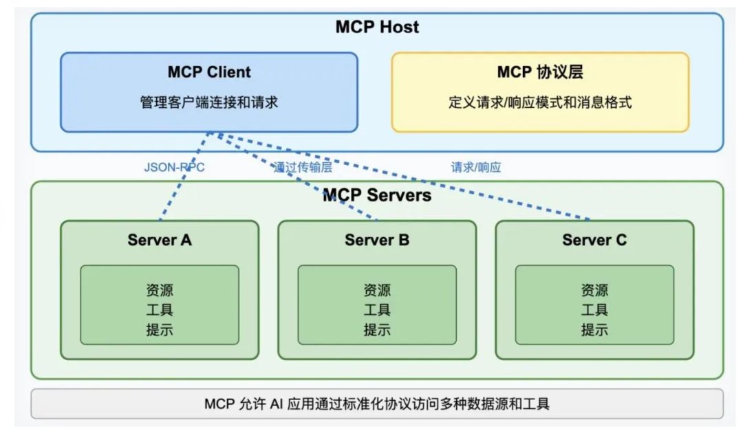 MCP 基于JSON-RPC 2.0协议构建,这是一种轻量级、跨语言的远程调用协议。无论是 Python 开发的大模型服务、Java 开发的企业 ERP 系统,还是 C++ 开发的工业传感器工具,都能通过 MCP 实现通信。