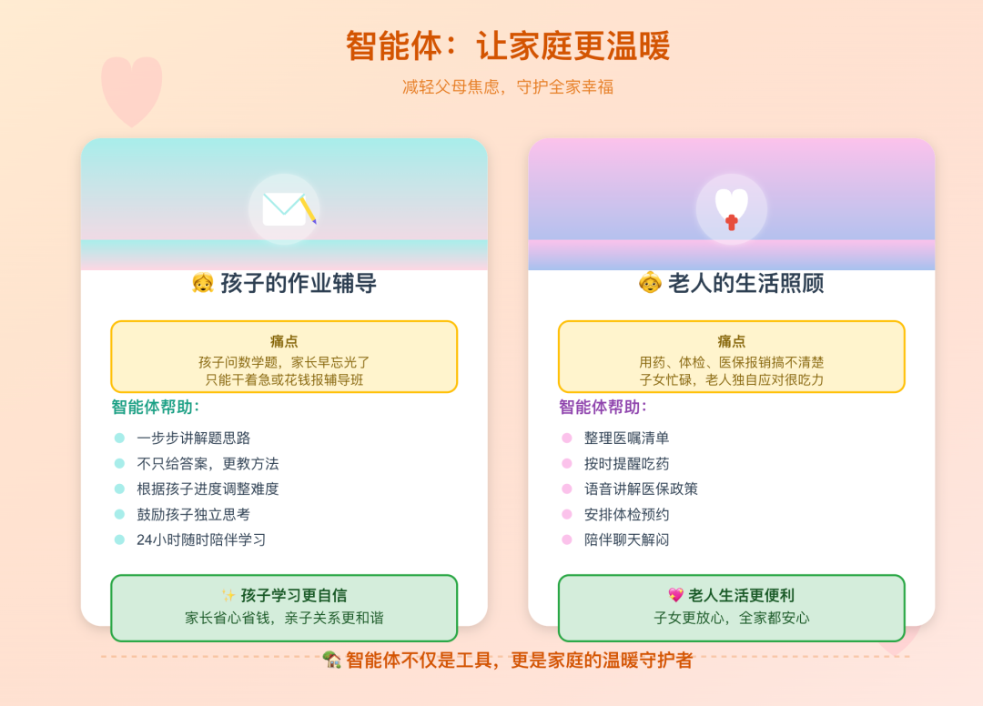 父母年纪大了,用药、体检、医保报销这些事搞不清楚。智能体可以帮他们整理医嘱、设置吃药提醒、解释政策,让老人生活更方便,也让你更放心。