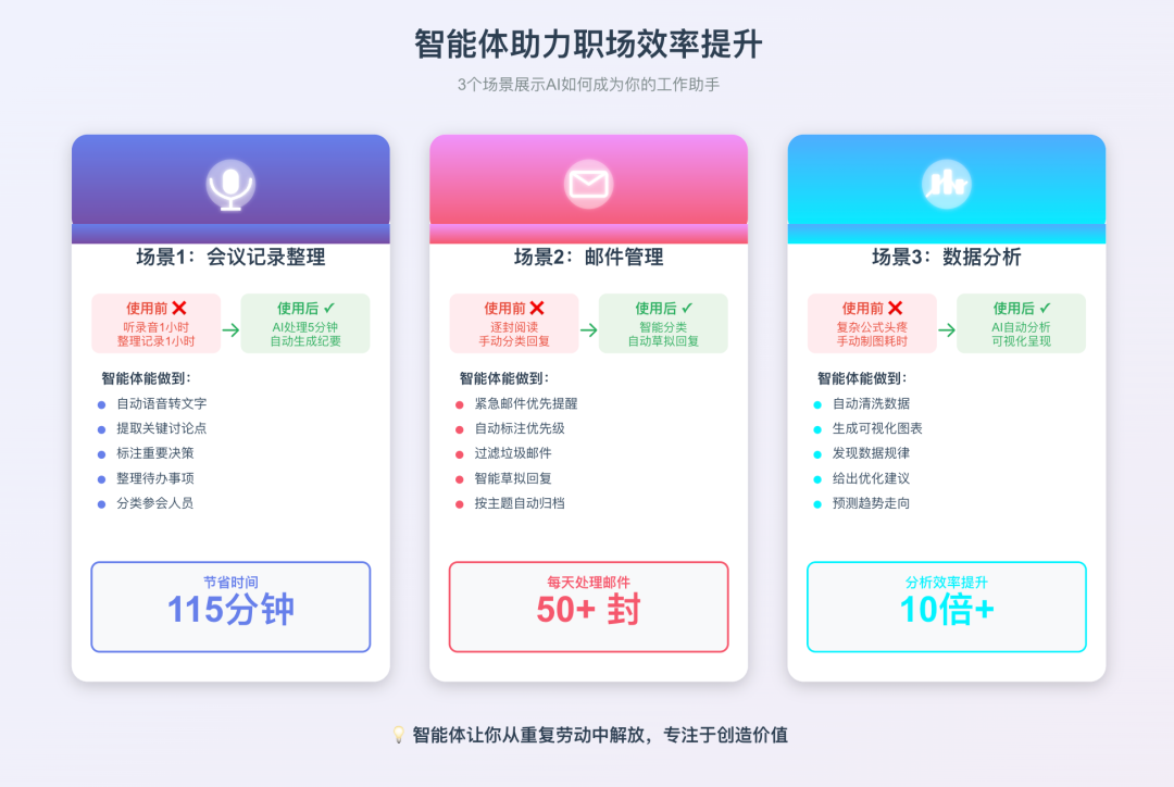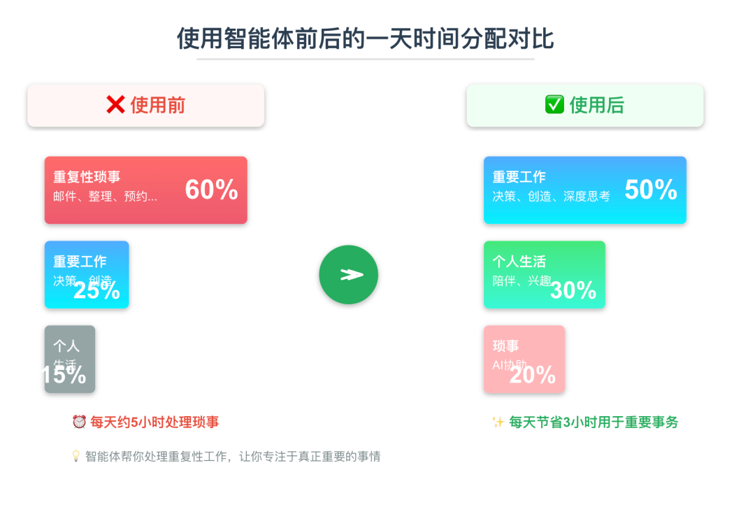 智能体的意义,就是把你从这些事情中解放出来。 让你有更多时间做真正重要的事:陪伴家人、发展兴趣、深度思考、创造价值。