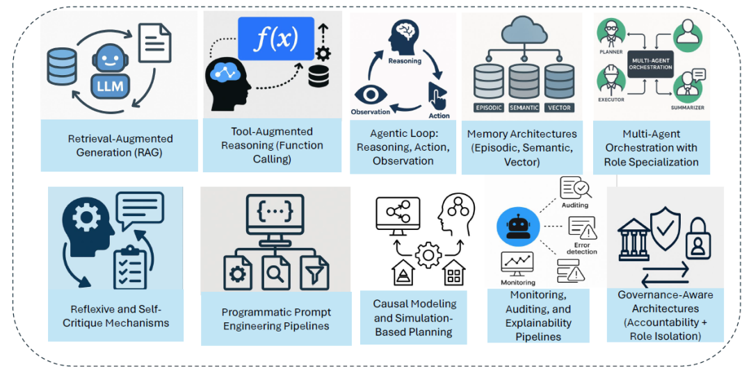 图8:展示十种新兴的架构与算法解决方案,包括RAG(检索增强生成)、工具使用(Tool Use)、记忆机制(Memory)、编排机制(Orchestration)以及反思机制(Reflexive Mechanisms),这些方法用于提升两个范式在可靠性、可扩展性与可解释性方面的表现