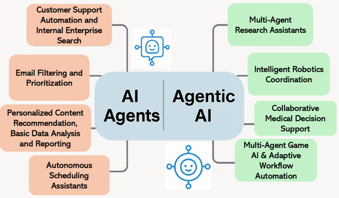 通过对体系结构演进、运行机制、交互模式与自治层级的顺序分析,我们对这两种范式进行了对比研究。常见的应用场景(如客户支持、日程安排、数据摘要)与Agentic AI的高级应用(如科研自动化、机器人协同、医学决策支持)形成鲜明对照。