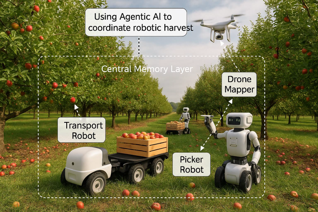 (b) 在苹果果园中,通过共享空间记忆和任务专属智能体(负责建图、采摘和运输)实现多机器人协同采收。