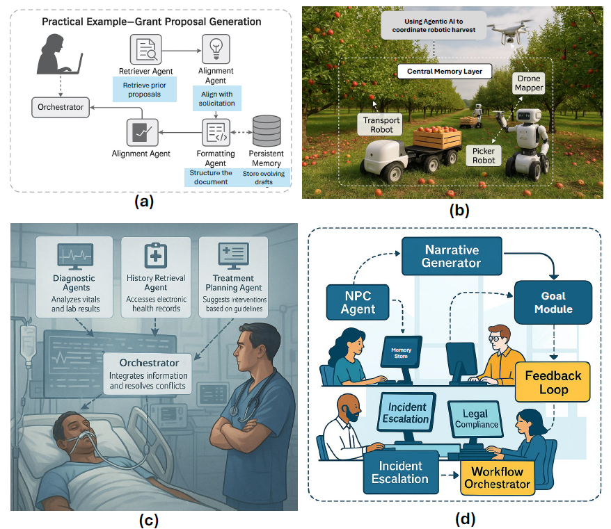 - 对于 Agentic AI,论文阐述了其在协同科研、机器人技术、医学决策支持 以及 自适应工作流自动化 等方面的实践案例,并辅以现实中的行业级系统示例。