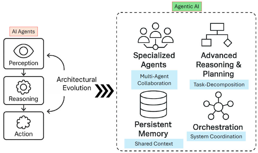 演进始于核心模块——感知(Perception)、推理(Reasoning)与行动(Action),并逐步扩展到更高级的组件,如专用智能体(Specialized Agents)、高级推理与规划(Advanced Reasoning & Planning)、持久记忆(Persistent Memory)以及编排层(Orchestration)。图中进一步描绘了涌现特性,如多智能体协作(Multi-Agent Collaboration)、系统协调(System Coordination)、共享上下文(Shared Context)和任务分解(Task Decomposition),所有这些都被包围在虚线边界内,以体现分层模块化以及向分布式、自适应的Agentic AI智能转变。
