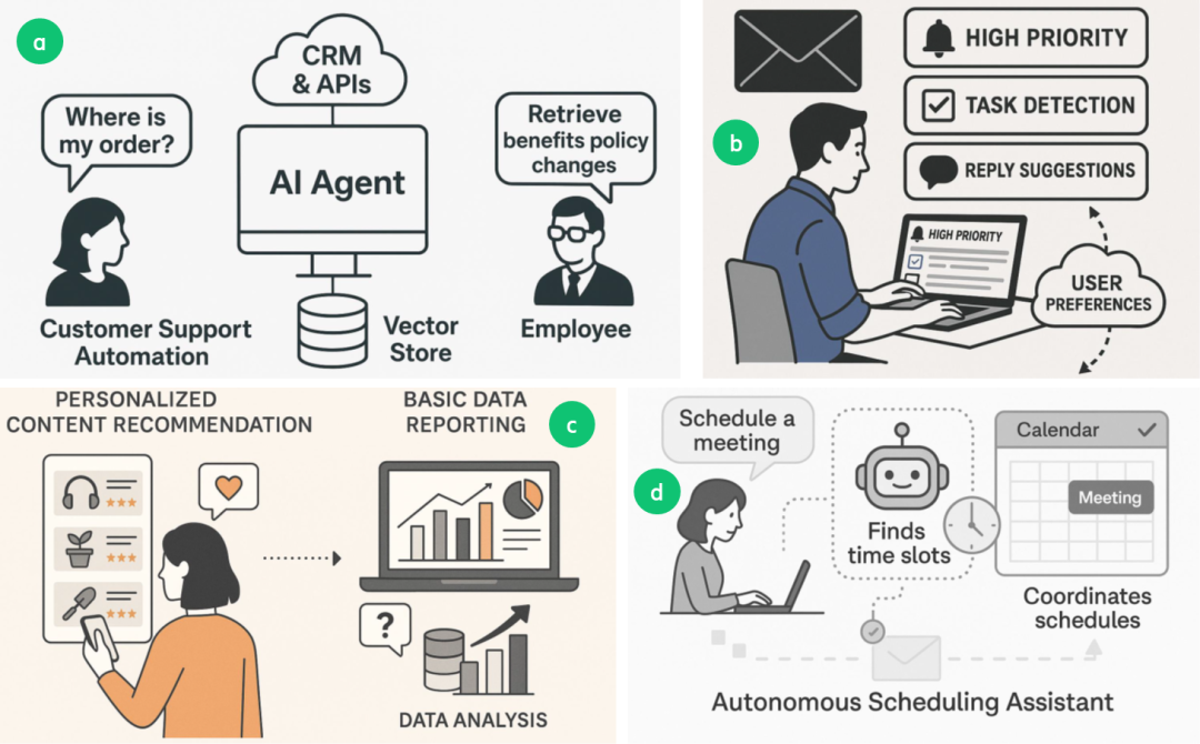 - 对于 AI Agents,论文展示了其在客户服务自动化、企业内部搜索、邮件优先级管理 和 日程安排 等任务中的作用;