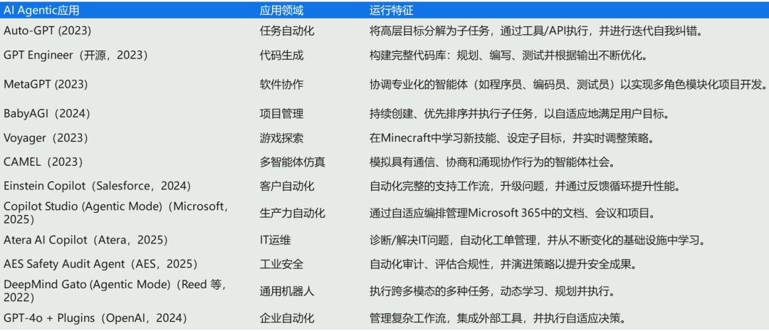 表3:2023–2025年代表性Agentic AI系统:应用场景与运行特征