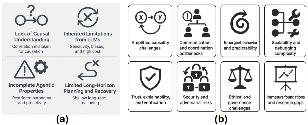 (a) AI Agent的主要局限性:包括因果关系缺失与浅层推理;