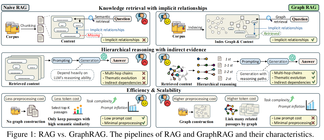 - 生成准确性: 基本RAG在简单事实检索任务中表现优于GraphRAG,但在复杂推理、上下文摘要和创造性生成任务中,GraphRAG表现出明显优势。