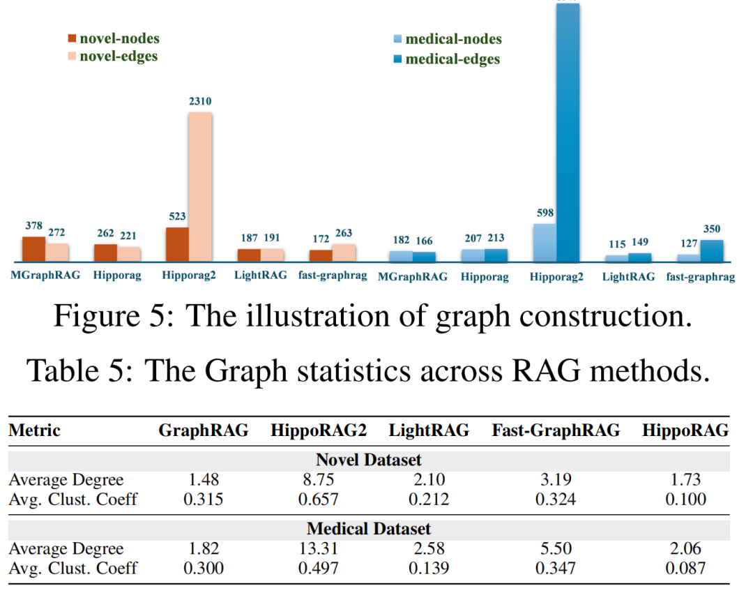 - 图复杂性: 不同GraphRAG实现生成的索引图显示出显著的结构差异,HippoRAG2生成的图更为密集,提高了信息连接性和覆盖范围。