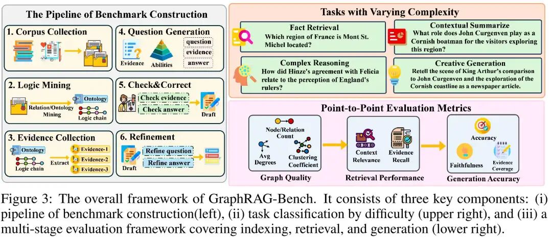 GraphRAG-Bench具有一个全面的数据集,任务难度逐渐增加,涵盖事实检索、复杂推理、上下文总结和创造性生成,并对整个流程进行系统评估,从图构建和知识检索到最终生成。