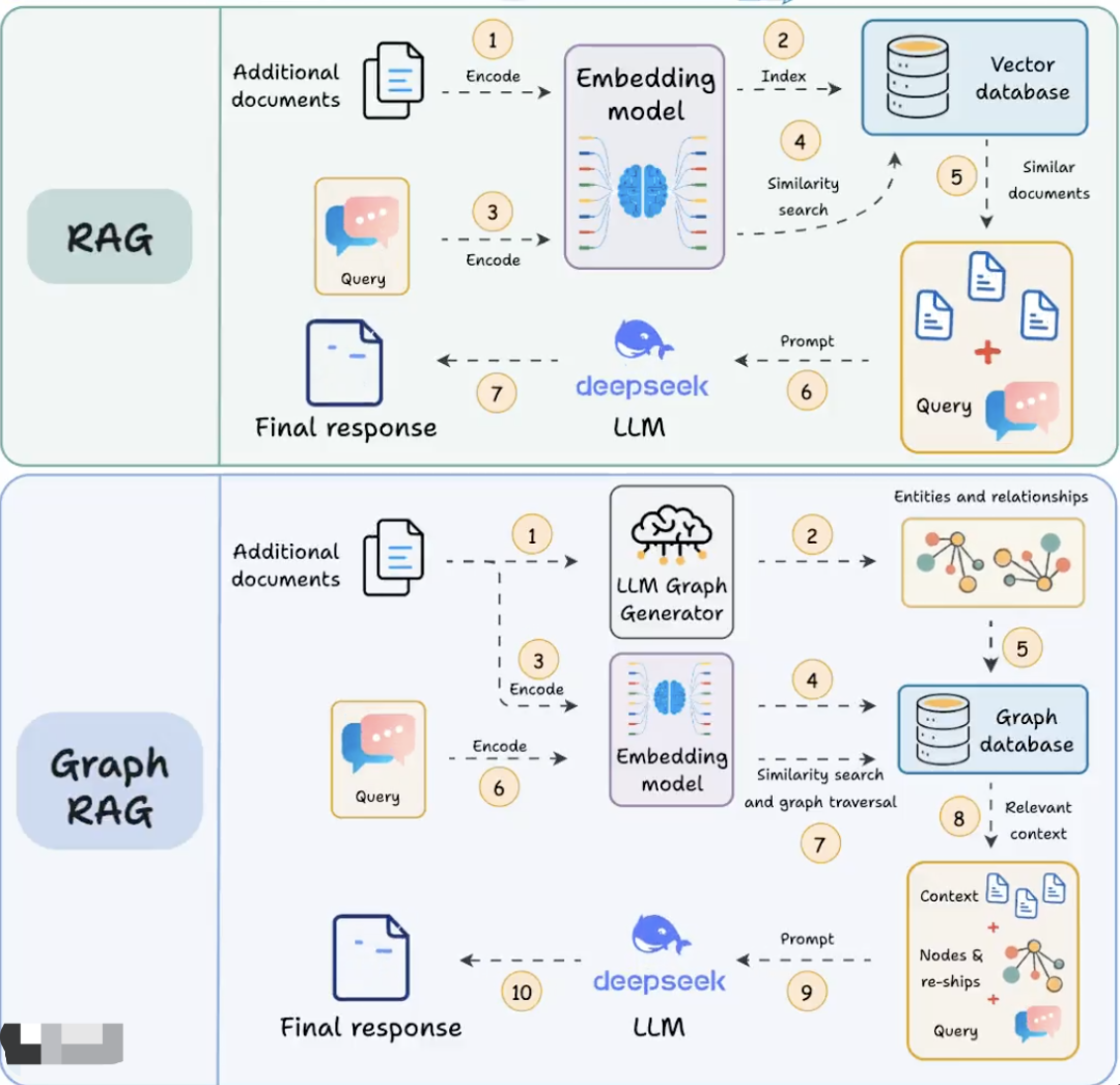 下面这张图可能更清晰的看出RAG和GraphRAG的区别。