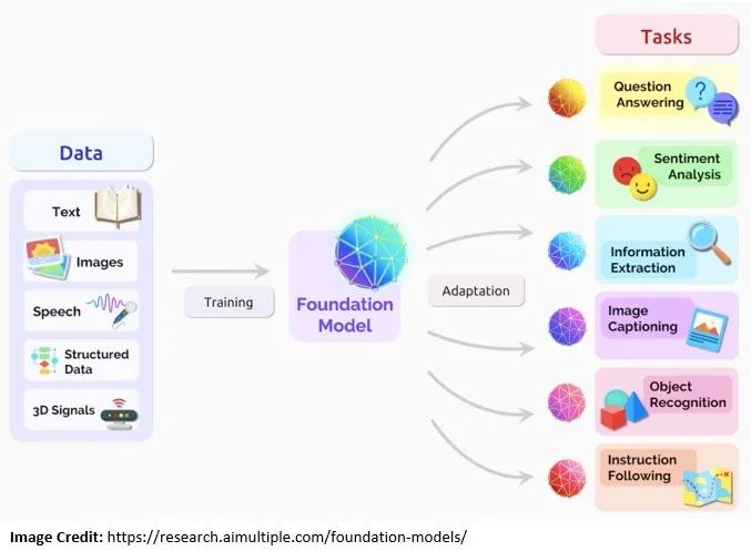 尽管如此,大语言模型通常在与语言相关的数据(如文本)上进行训练。而基础模型通常在多模态数据(文本、图像、音频等的混合)上进行训练。更重要的是,基础模型旨在作为更特定任务的基础或基石: