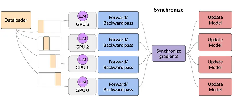 全分片数据并行(FSDP)通过在多个GPU之间分布(分片)模型参数、梯度和优化器状态来减少内存使用。