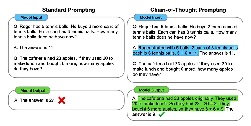 思维链(CoT)提示(Wei等人,2022)会生成一系列短句子,逐步描述推理逻辑,即推理链或推理依据,最终得出答案。在使用大型模型(例如参数超过500亿的模型)处理复杂推理任务时,CoT的优势更为明显。而简单任务使用CoT提示的受益则相对较小。