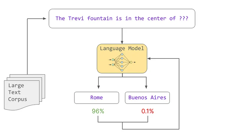 在训练过程中,从语料库中提取文本序列并进行截断。语言模型计算缺失单词的概率,然后通过基于梯度下降的优化机制对这些概率进行微调,并反馈给模型以匹配真实情况。这个过程在整个文本语料库上重复进行。