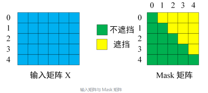 第一步: 是 Decoder 的输入矩阵和 Mask 矩阵,输入矩阵包含 “ I have a cat” (0, 1, 2, 3, 4) 五个单词的表示向量,Mask 是一个 5×5 的矩阵。在 Mask 可以发现单词 0 只能使用单词 0 的信息,而单词 1 可以使用单词 0, 1 的信息,即只能使用之前的信息。