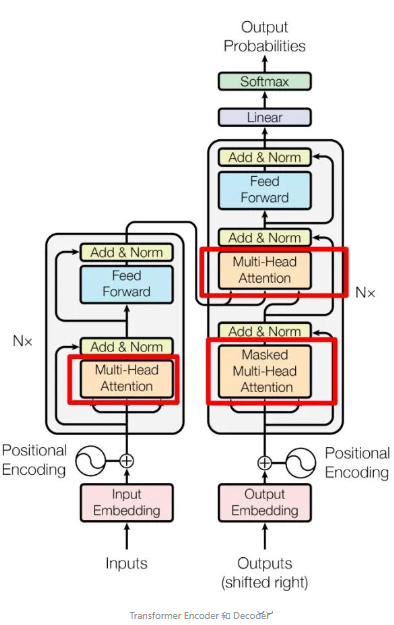 上图展示了 Transformer 的架构组成,左侧是编码器模块(Encoder block),右侧是解码器模块(Decoder block)。图中红色标注的部分是多头注意力机制(Multi-Head Attention),它由多个自注意力(Self-Attention)单元构成。可以看到,编码器模块包含一个多头注意力层,而解码器模块则包含两个——其中一个使用了掩码机制(Masked)。