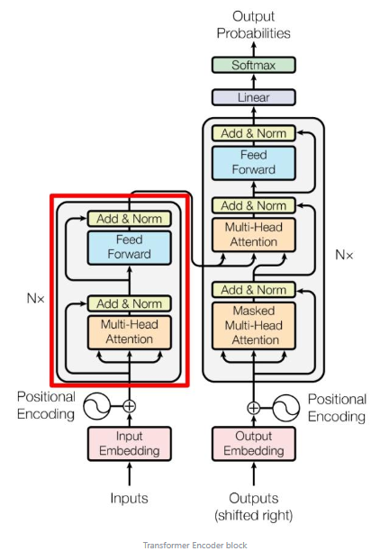图中红色高亮部分展示了 Transformer 编码器块(Encoder block)的具体结构,它主要由四个核心组件顺序组成: