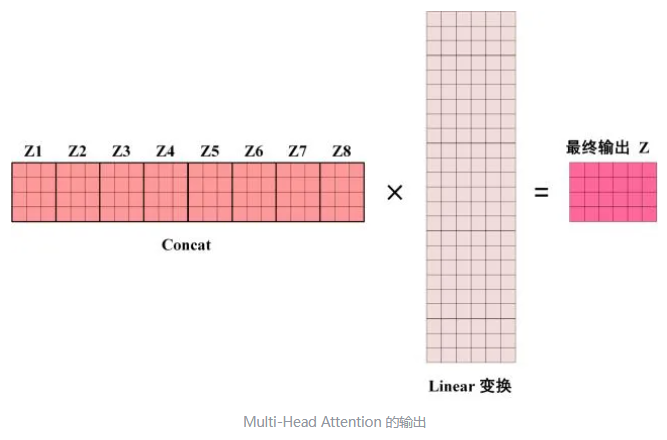 得到 8 个输出矩阵 𝑍1 到 𝑍8 之后,Multi-Head Attention 将它们拼接在一起 (Concat),然后传入一个Linear层,得到 Multi-Head Attention 最终的输出Z。