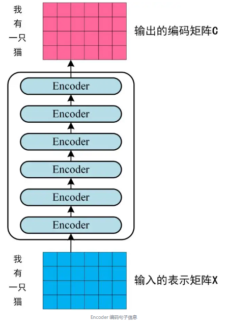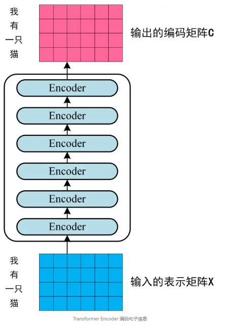 第二步: 将得到的单词表示向量矩阵 (如上图所示,每一行是一个单词的表示 x) 传入 Encoder 中,经过 6 个 Encoder block 后可以得到句子所有单词的编码信息矩阵 C,如下图。单词向量矩阵用 𝑋𝑛×𝑑 表示, n 是句子中单词个数,d 是表示向量的维度 (论文中 d=512)。每一个 Encoder block 输出的矩阵维度与输入完全一致。