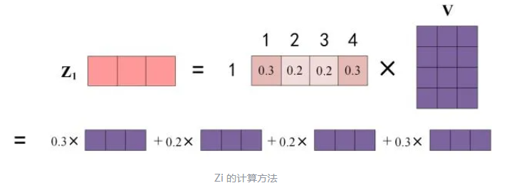 上图中 Softmax 矩阵的第 1 行表示单词 1 与其他所有单词的 attention 系数,最终单词 1 的输出 𝑍1 等于所有单词 i 的值 𝑉𝑖 根据 attention 系数的比例加在一起得到,如下图所示: