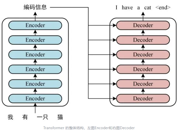 首先介绍 Transformer 的整体结构,下图是 Transformer 用于中英文翻译的整体结构: