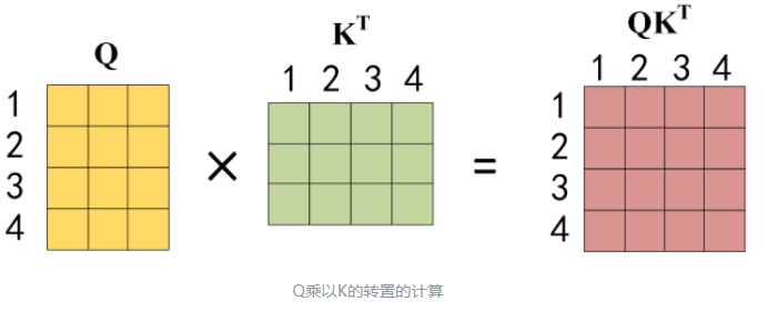公式中计算矩阵Q和K每一行向量的内积,为了防止内积过大,因此除以 𝑑𝑘 的平方根。Q乘以K的转置后,得到的矩阵行列数都为 n,n 为句子单词数,这个矩阵可以表示单词之间的 attention 强度。下图为Q乘以 𝐾𝑇 ,1234 表示的是句子中的单词。