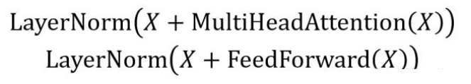 其中 X表示 Multi-Head Attention 或者 Feed Forward 的输入,MultiHeadAttention(X) 和 FeedForward(X) 表示输出 (输出与输入 X 维度是一样的,所以可以相加)。