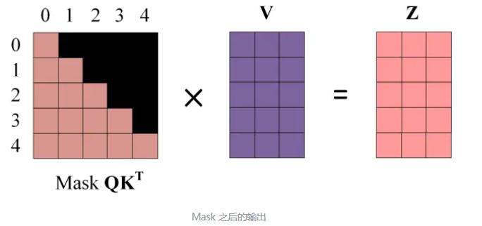 第四步: 使用 Mask 𝑄𝐾𝑇与矩阵 V相乘,得到输出 Z,则单词 1 的输出向量 𝑍1 是只包含单词 1 信息的。