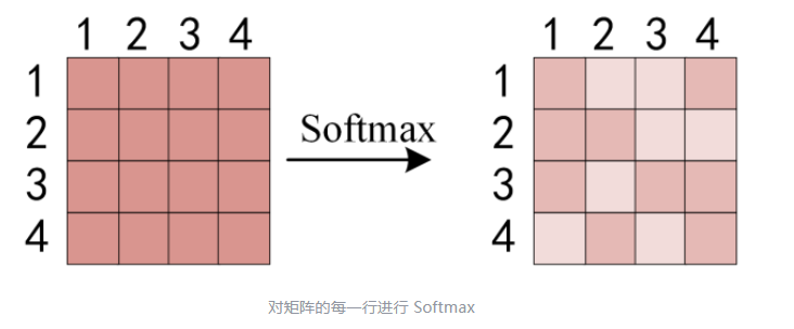 得到𝑄𝐾𝑇 之后,使用 Softmax 计算每一个单词对于其他单词的 attention 系数,公式中的 Softmax 是对矩阵的每一行进行 Softmax,即每一行的和都变为 1。